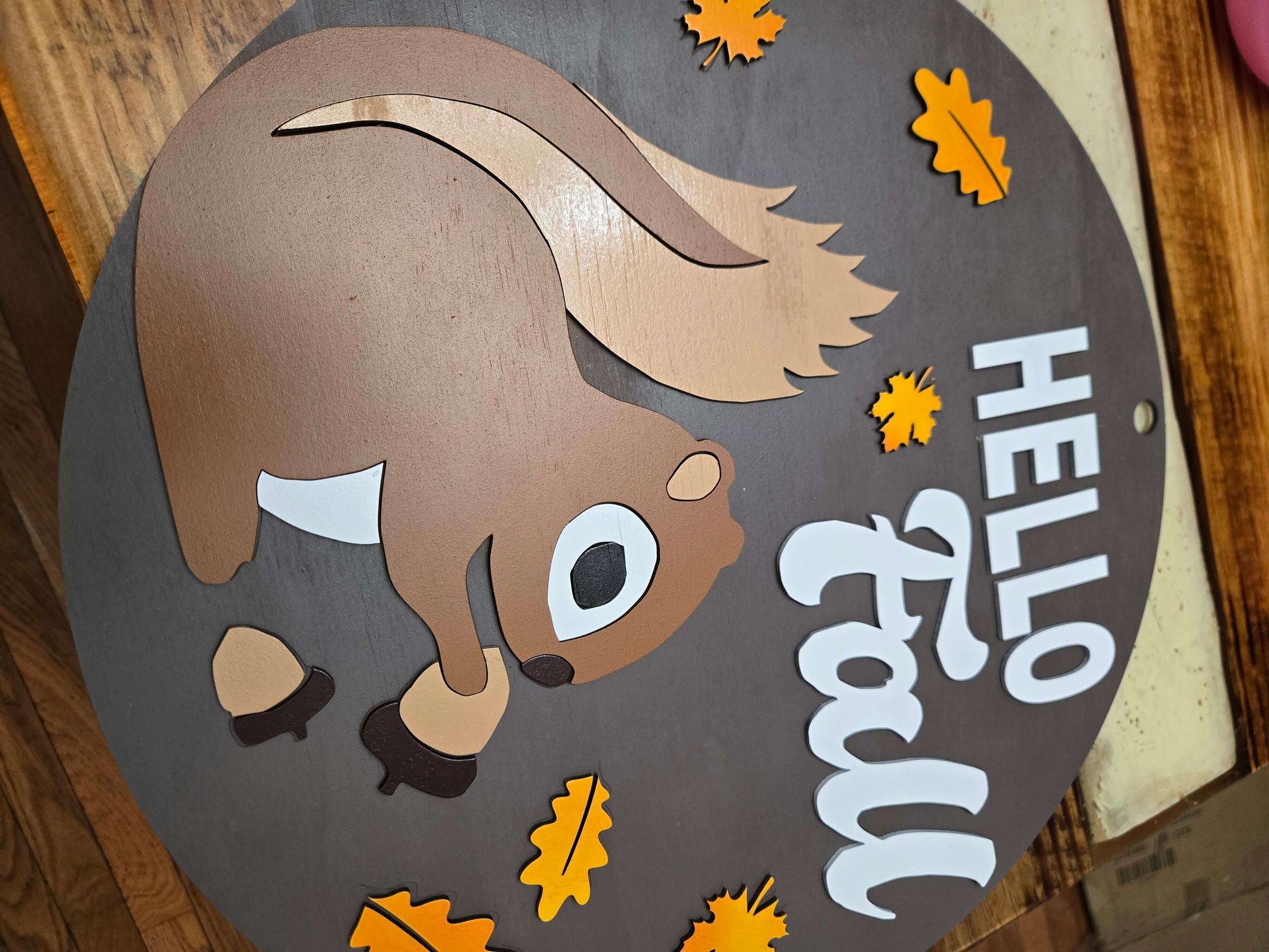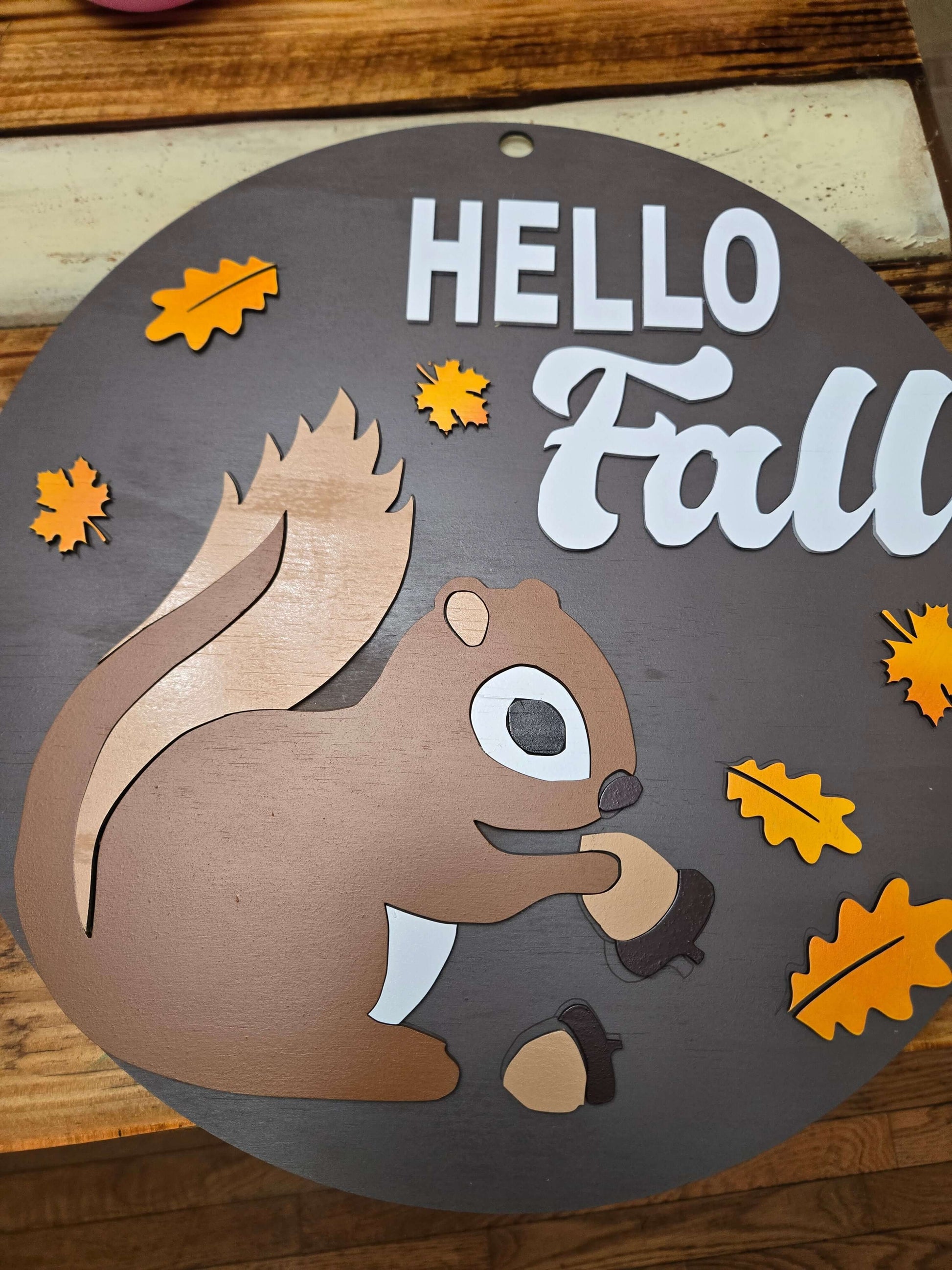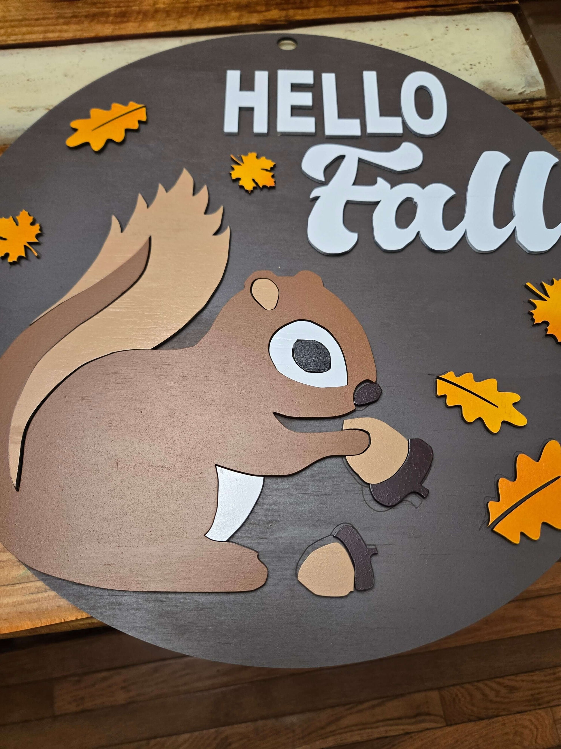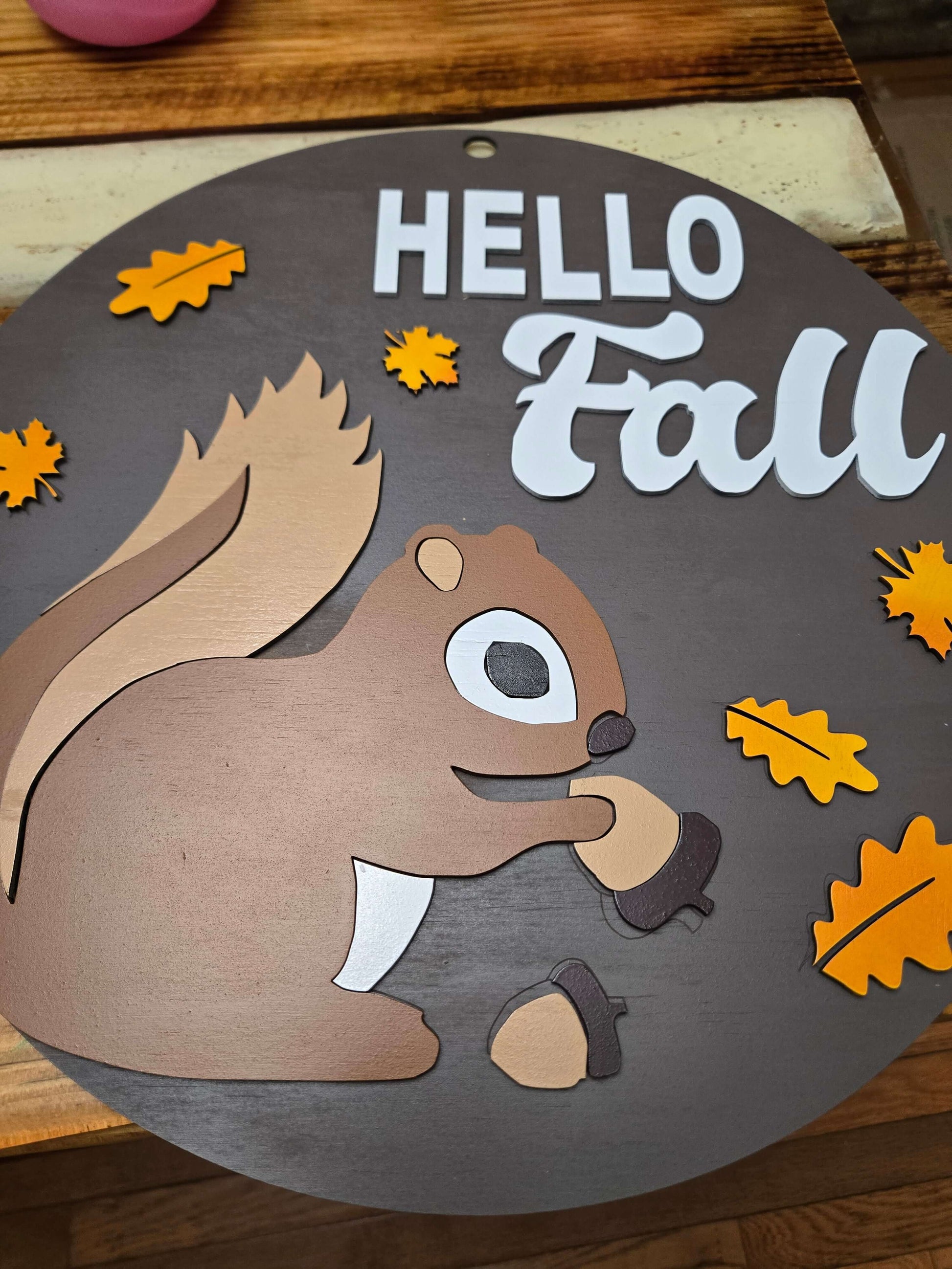 hello squirrel Embrace the cozy charm of autumn with our "Hello Fall" Squirrel Wooden Home Decor Sign, a delightful addition to your seasonal decor collection. Crafted from high-quality, durable wood, this whimsical sign features an adorable squirrel design, perfectly capturing the essence of fall with its playful spirit. The warm, earthy tones and intricate detailing make it a stunning focal point for your entryway, living room, or porch, inviting guests to celebrate the beauty of the season. Measuring at a convenient size, it’s easy to hang or display on a shelf, adding a touch of rustic elegance to any space. Whether you're decorating for a festive gathering or simply want to bring the warmth of fall indoors, this charming sign is sure to evoke smiles and create a welcoming atmosphere. Make your home a cozy haven this autumn with this enchanting piece that embodies the joy of the season!